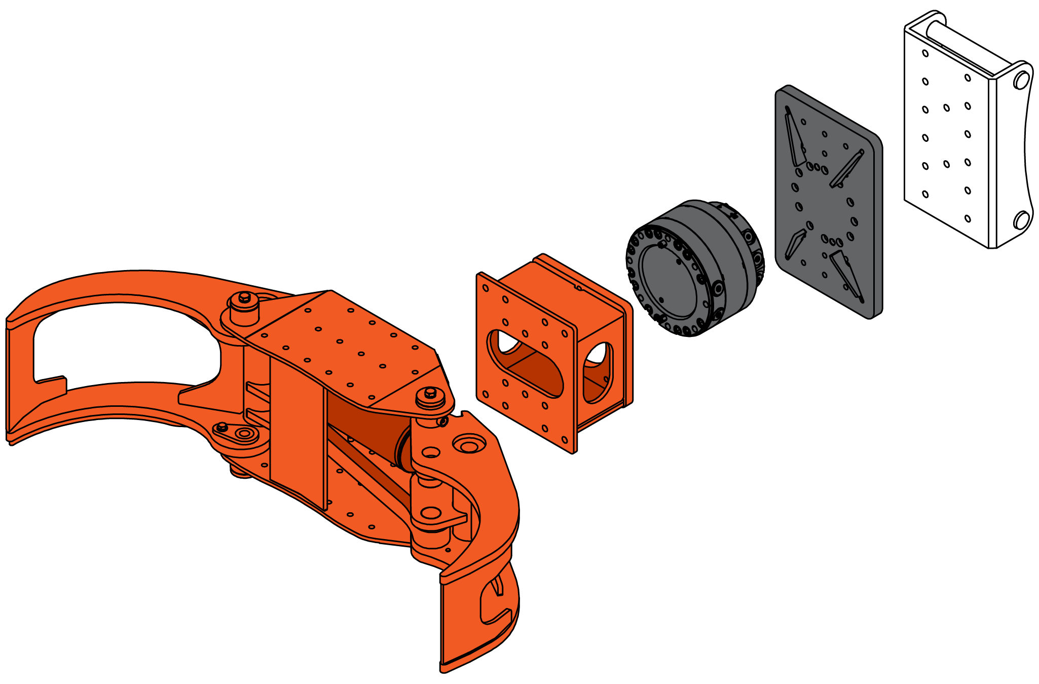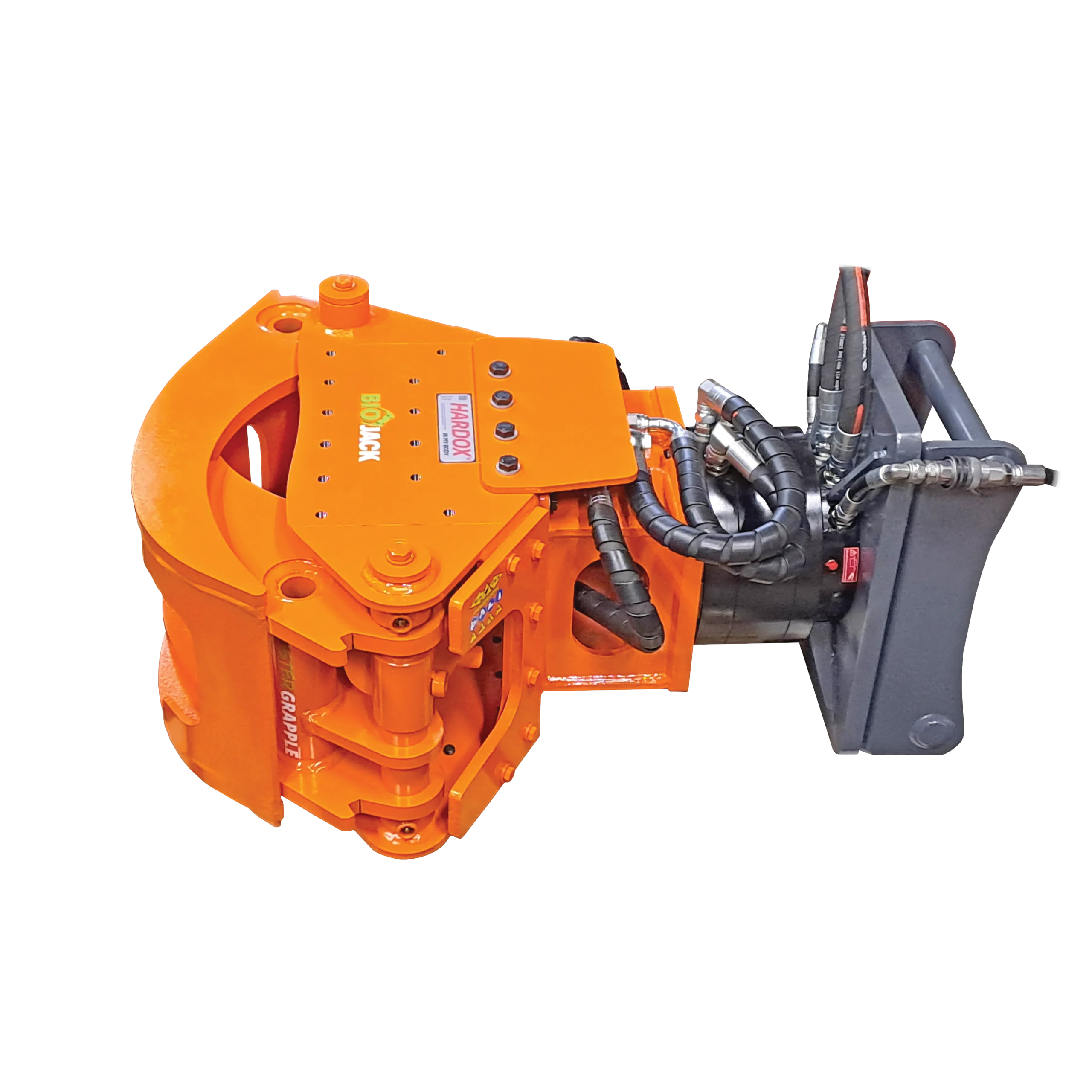 The rotator kit is bolt-fastened to the grapple frame, so it’s easy to retrofit. Any quick coupling can be attached to the adapter plate.