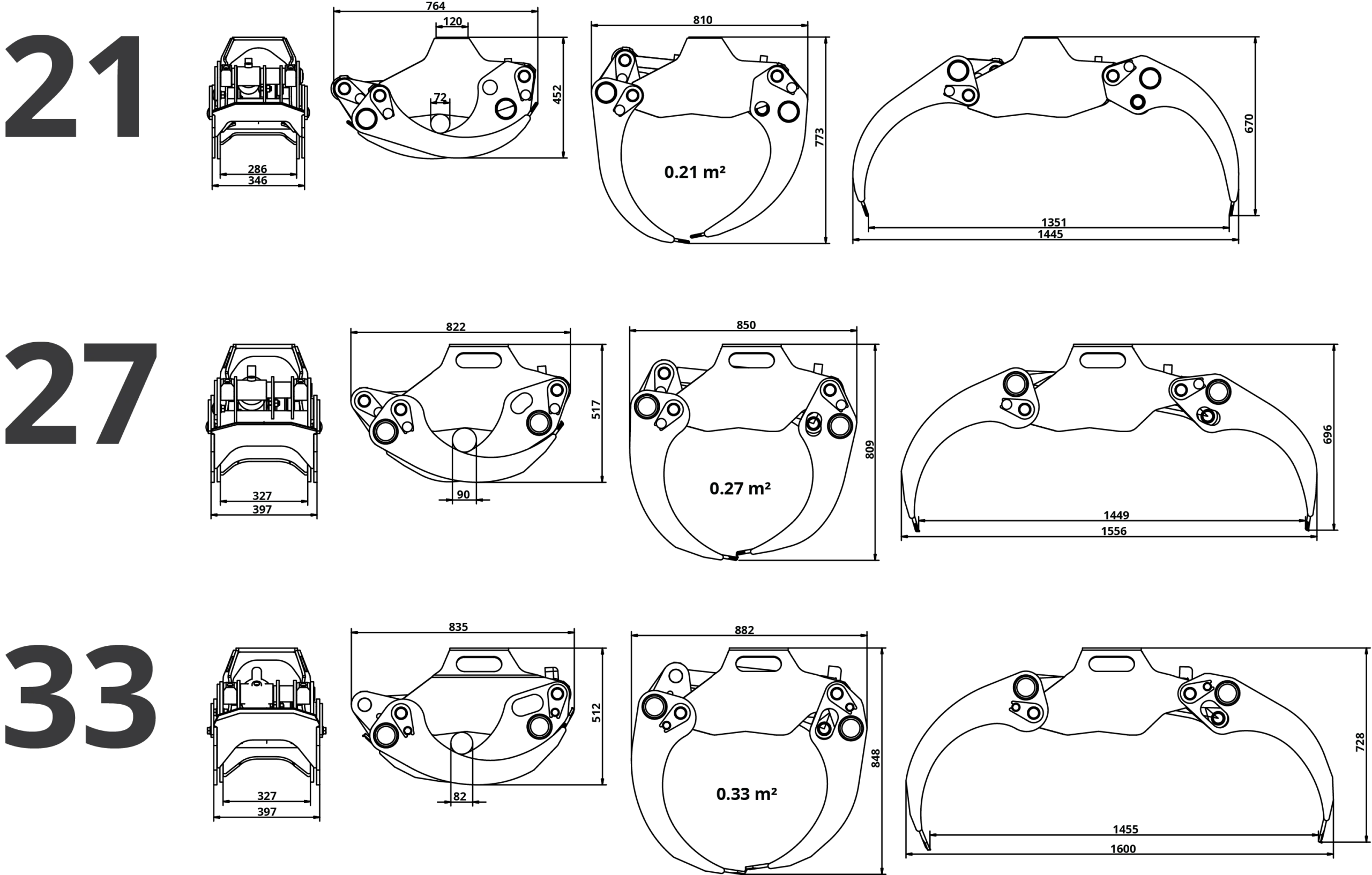 Biojack product range includes  small and medium grapple models, Biojack 21, 27, 33, with roundwood or brushwood clamps (4-finger).